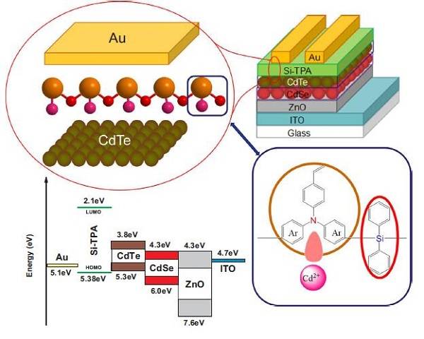 CdTe/CdSe̫���늳ؽY��ʾ��D��Si-TPA ���W�Y����CdTe, CdSe, ZnO, ITO, Si-TPA ��Au���ܼ�.