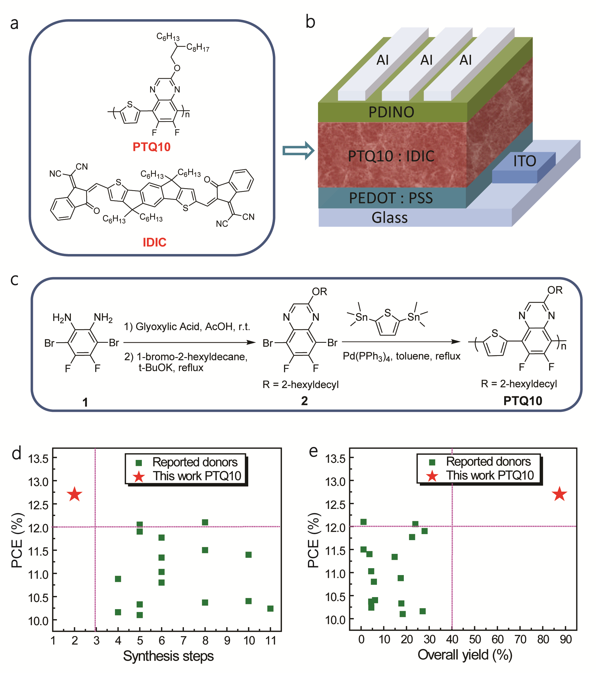 �ڇ�����Ȼ�ƌW����ί���п�Ժ�Ȍ��Ŀ��֧�������п�Ժ���W���ЙC���wԺ���c�����������Ժʿ����־�����о��T�����Ҽ{�ƌW����κ־���о��T�����OӋ���ϳ���һ���ͳɱ���Ч�ľۺ���o�w����PTQ10�����ӽY��Ҋ�D1(a)����PTQ10��һ�N�Y�����ε�D-A��������������ԭh����o�w��Ԫ�������������w��Ԫ������������������������Ǟ�����߾ۺ�����ܽ��Բ����������ա������p��ԭ��ȡ���Խ��;ۺ����HOMO�ܼ�����߿�Ѩ�w������ԓ���ӿ���ͨ�^���r��ԭ���σɲ��ϳɣ��D1(c)����ͬ�r���F�ӽ�90%�Ŀ��a����ʹ��ԓ���ϵijɱ����������Ҫ���ǣ�ʹ��PTQ10��o�w���Y���������ε�n-���ЙC�댧�wIDIC���D1(a)�������w�Ƃ�ľۺ���̫���늳أ������Y��Ҋ�D1(b)������������D�QЧ���_��12.70%��ͬ�r����Y��������Ч��Ҳ�_����12.13%�����Ї�Ӌ���ƌW�о�Ժ�_�J��Ч�ʞ�12%�������һ��ԌӺ����100nm��300nm����������Ч�ʶ��ܳ��^10%���@�dz������������Ĵ���e�Ƃ䡣�c��ǰ�īI�����Ч�ʳ��^10%��������Ч�ۺ���o�w������������PTQ10�oՓ�Ǻϳɲ��E���a�ʺ�Ч���϶����зdz�ͻ���ă��ݣ�Ҋ�D1(d,e)�������]���ͳɱ�����Ч�ʺͺ�Ȳ����еȃ��c��PTQ10�O��ϣ���ɞ�ۺ���̫���늳��̘I�����еľۺ���o�w������