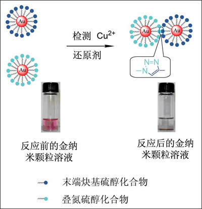 ���������Ҽ{�ƌW�����Y�d���о�С�M����ꖵ����ý�{���w����Click���W���lչ��һ�Nֱ�������۶��ԙz�y��Һ��Cu(��)���·���(Angew. Chem. Int. Ed.,2008,47,7454-7456)����Click ���W���@һ����ָCu(I)���������������քe����ĩ��Ȳ���ͯB�����F�ķ����M��ż�����Cu(I)�Ǵ����������п�������ԓ������z�y�������~����ꖵ����Ⱥϳ���ĩ��Ȳ����ĩ�˯B������Ľ�{���w����֮�������Ľ�{�����ӻ������Cu(��)��Һ�м���߀ԭ��[Cu(��)���Ա�����߀ԭ����Cu(I)]��Cu(I)�������ʹ��{�����ӱ����Ȳ���ͯB������l������������Һ��ͨ�^��{�����Ӿۼ����a�������z�y��Һ�е�Cu(��)������]��Cu(��)�t��{�����Ӳ����ۼ��Ķ�ʹ��Һ�����ϼtɫ(�D)��
