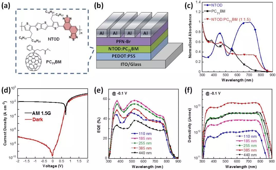�ۺ���NTOD��һ�N����Բ�[3,2-b]��Ԟ�o�w��Ԫ����[1,2-c:5,6-c]��[1,2,5]�����(NT)�����w��Ԫ�Ľo�w-���w��խ��ϵ��ܗ�ۺ�����cPC71BM�Ĺ��챡Ĥ���շ�����300 ~ 830 nm��ͨ�^��NTOD:PC71BM���ԌӺ�ȵ��{(di��o)�،�(sh��)�F(xi��n)����������ܶȵ��@�����ͣ�����(qi��ng)��̽�y���Ķ��O�����ܣ�ͬ�r(sh��)�����^�ߵ��������D(zhu��n)��Ч�ʡ���(d��ng)���ԌӺ�Ȟ�385 nm�r(sh��)���ۺ����̽�y����-0.1 Vƫ���µİ������6.69 × 10�C10 A cm-2���ڨC0.1 Vƫ����������440 ~ 800 nm�Ĺ������εı�̽�y�ʾ����^1013 Jones��̎��750 nm�Ĺ������L���_(d��)������̽�y�ʞ�1.50 × 1013 Jones����푑�(y��ng)�ʞ�0.22 A W-1���@Щ�Y(ji��)����������NTOD:PC71BM���ЙC(j��)��̽�y�����ЏV韵đ�(y��ng)��ǰ����