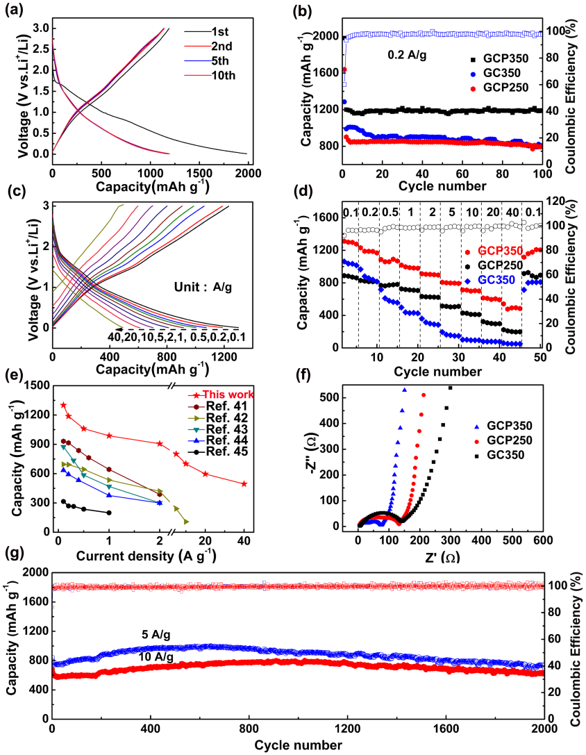 �������σ��c��ԓ�ͺϲ���������x��늳ص���֧��ؓ�Oչʾ���O�õ�늻��W���ܣ���0.1 A g-1������ܶ��£�������������_1301 mAh g-1��������ܶ���ߵ�40 A g-1����������Ȼ�_��494 mAh g-1���@ʾ��Խ�ı������ܣ���10 A g-1����ܶ���ѭ�h2000Ȧ�������������_��98.6%��ÿȦ������˥�p���ʃH��0.0007%��ԓ��СMOF�{���ͺϲ��ϵ�늻��W�����h�h���^��֮ǰ���������MOF��ؓ�O���ϡ�