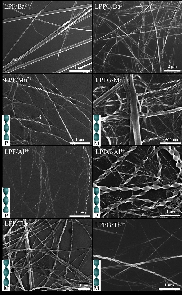 �D2. ���z�����c��ͬ�x���γɵ����z������R�DLPF/Ba2+, LPF/Mn2+, LPF/Al3+��LPF/Tb3+,LPPG/Ba2+, LPPG/Mn2+, LPPG/Al3+ LPPG/Tb3+����ͬ�����Լ{���w�S�Y�����������ķֱ档
