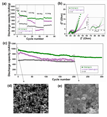 �D5.��a���������ܵı��^����b��ͨ�^EIS�@�õ�Nyquist�D��c��0.3 A/g����ܶ��yԇ��ѭ�h�����ԣ���d-e��ѭ�h�yԇǰ��ѭ�h�yԇ��{���^�V����SEM�D��