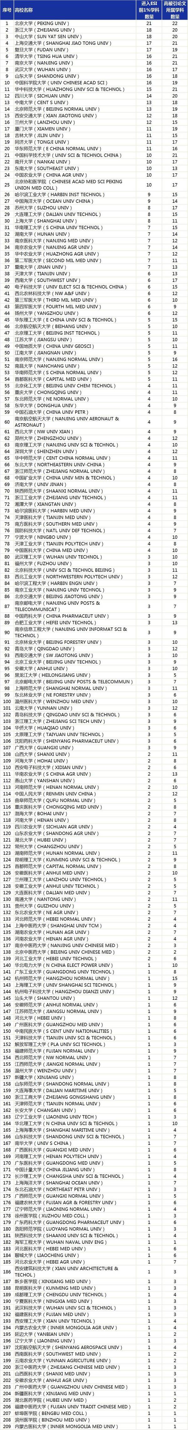 ����ESI������Ľ綨���߱���Փ��ָ��ʮ��������l������ǰ1%��Փ�ġ����xESIǰ1%�߱���Փ�Ĕ��dzɹ������ָ�ˡ�����桷�@ʾ�����@209����У�У����A��W��1091ƪESI�߱���Փ�Ĕ�λ�Ӹ�У��1λ��������W��1061ƪESI�߱���Փ�Ĕ�λ�Ӹ�У��2λ�������l������1���㽭��W��ESI�߱���Փ�Ĕ���λ�и�У��3λ���Ϻ���ͨ��W���Ї��ƌW���g��W���͵���W���Ͼ���W����ɽ��W�������I���I��W���A�пƼ���W�M��ǰʮ����Ҫָ�����ǣ��Ї��ƌWԺ��W������2012�꣬���2012��֮ǰ�Ї��ƌWԺ�о���Ժ�ĸ߱���Փ�Ĕ���δӋ�����С�