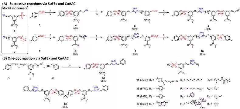 ������CCuAAC��SuFEx�õ����������ԣ��������Ⱥϳɺ���Ȳ���ͻ�������ģ�ͻ�����1�Լ����ЯB���Ͷ����������������ģ�ͻ�����2���������M�������B�m��SuFEx/CuAAC���淴����ÿһ�������Įa�ʽӽ�100%���@Щ������������һ�N�c�����W���M�в�����Ӱ�����һ�N�c�����W������܈F�������ԡ��S���������DZ�ݵ�ͨ�^���uβ��ʽ��������CuAAC��SuFEx����Ĵ������F�˶��ߵ�һ偷�������������1��3��11��ģ�ͷ����_���˽ӽ��������D�������⣬һ偷��Mһ�������ں��в�ͬ���܈F�ĵ�����Hˮ���F��ϩ�����u�����ɹ���F�Լ���ȣ����_����85~99%�ĸ��D���ʡ�����С���ӵ�ģ�ͷ����C��CuAAC��SuFEx�����������Ժ�Ч�ʣ��O���m�������оۺ�����OӋ�ϳɡ�