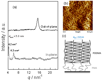 �D2. ��(d��ng)���מ�PMA����ˢ�r(sh��)��PODMA����ˢ��(a) GI-WAXD�D�V, (b) AFM�߶ȈD���ۼ��B(t��i)�Y(ji��)��(g��u)ʾ��D��