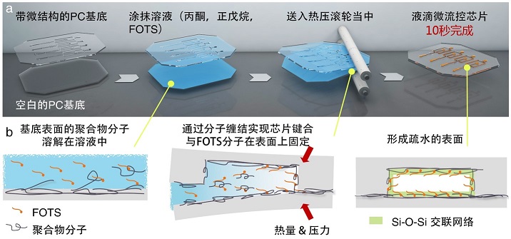 ���˽�Q������(w��n)�}�������о��T�F(tu��n)�(du��)�����һ�N�µĻ��ھ�̼������polycarbonate, PC�����ϵ�Һ��оƬ�Ƃ䷽�����܉��ڌ�(sh��)�F(xi��n)����оƬ�I�ϵ�ͬ�r(sh��)����ܵ��ı�����ˮ�������������̈D������әC(j��)����D1��ʾ��PC����Һ��оƬ�Ļ��ײ��Ͼ���ͻ����(y��u)�����ԣ�ע�����ܺá����Ժá��ɱ��͡��ڃ�ƬPC�����I������ͿĨ�ϰ����б�ͪ���������ȫ���������ȹ��飨FOTS����һ������Һ���ڱ�ͪ�������£�PC������L(zh��ng)朷���ጷŵ���Һ�С�Ȼ����ƬPC����(du��)�R������ቺ�L݆��(d��ng)�С����ڱ�ͪ�c������ķ��c(di��n)�^�ͣ��ܟ��Ѹ�ٚ⻯�����x��PC�����c�I�����ϵ�PC�����γ��p�Y(ji��)����(sh��)�F(xi��n)оƬ�I�ϡ�����ڱ�ͪ��������⻯��F(xi��n)OTS����ճ����оƬ�ܵ����棬���ڿ՚���ˮ���ӵ������£��l(f��)��(li��n)�ɾW(w��ng)�j(lu��)�γɷ�(w��n)������ˮ�ӣ���(sh��)�F(xi��n)������ˮ���ԡ�һ��������(g��)�������̃H��10�뼴����ɣ��@�����ڌ�(sh��)�F(xi��n)Һ��оƬ�Ĵ�Ҏ(gu��)ģ�ӹ��Ƃ䡣�c�F(xi��n)���о�������ȣ�һ�����Ƃ��Һ��оƬ���H�����^�ߵ��I�Ϗ�(qi��ng)�ȡ����õ���ˮ���ܣ����ҘO��ؿs����оƬ���Ƃ�r(sh��)�g�����1��ʾ��