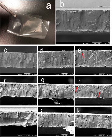 �D2. (a) 5 wt % BE-CNF/PVA�ͺ�Ĥ������Ƭ���ͺ�Ĥ�M����SEM�D��(b) ��PVA�� (c) 1 wt% BCNF/PVA��(d) 5 wt% BCNF/PVA��(e) 10 wt% BCNF/PVA��(f) 1 wt% BT-CNF/PVA��(g) 5 wt% BT-CNF/PVA��(h) 10 wt% BT-CNF/PVA��(i) 1 wt% BE-CNF/PVA��(j) 5 wt% BE-CNF/PVA��(k) 10 wt% BE-CNF/PVA��