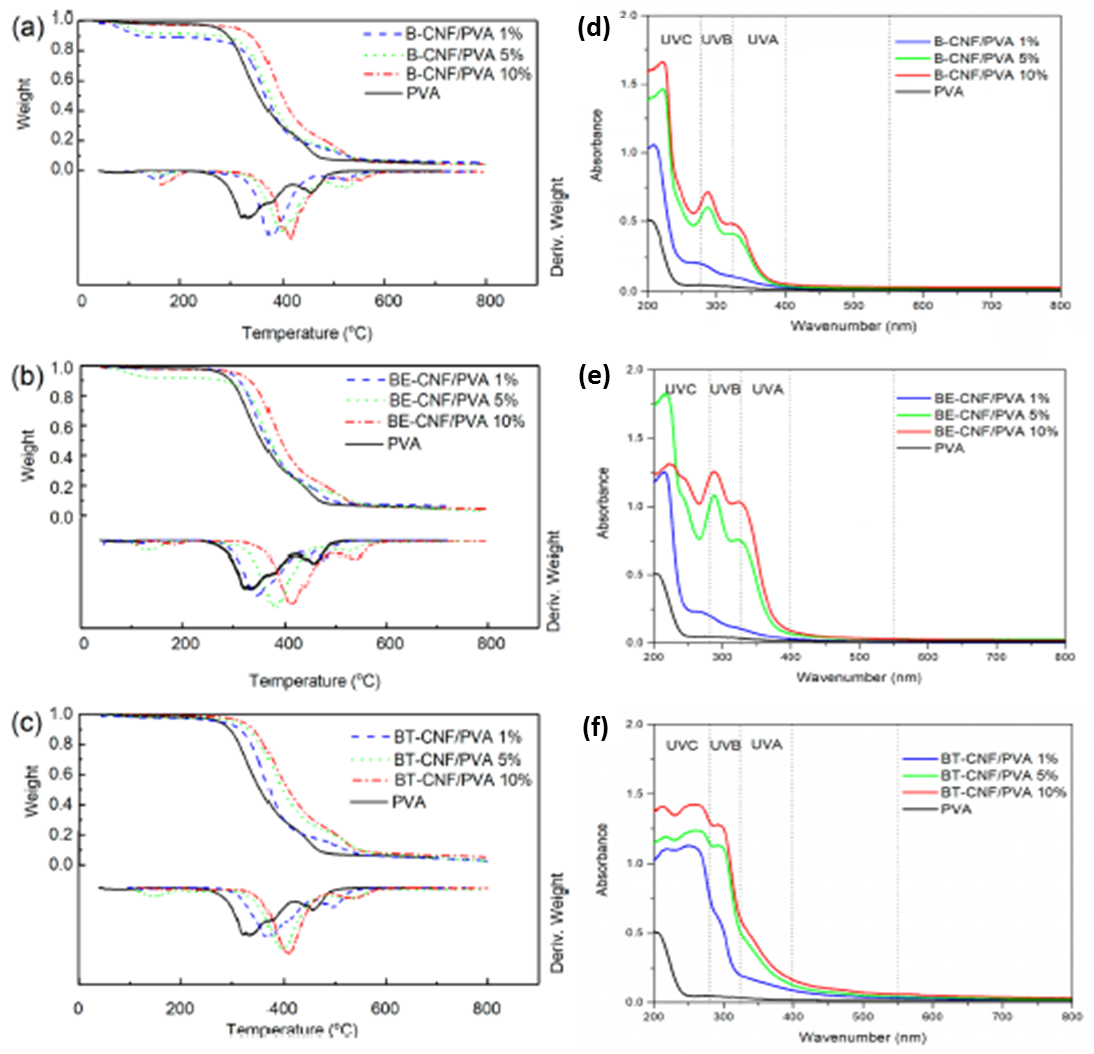 �D3. �ͺ�Ĥ�ğ����W�����D��(a) B-CNF/PVA��(b) BE-CNF/PVA��(c) BT-CNF/PVA���ͺ�Ĥ���������ՈD��(d) B-CNF/PVA��(e) BE-CNF/PVA��(f) BT-CNF/PVA��