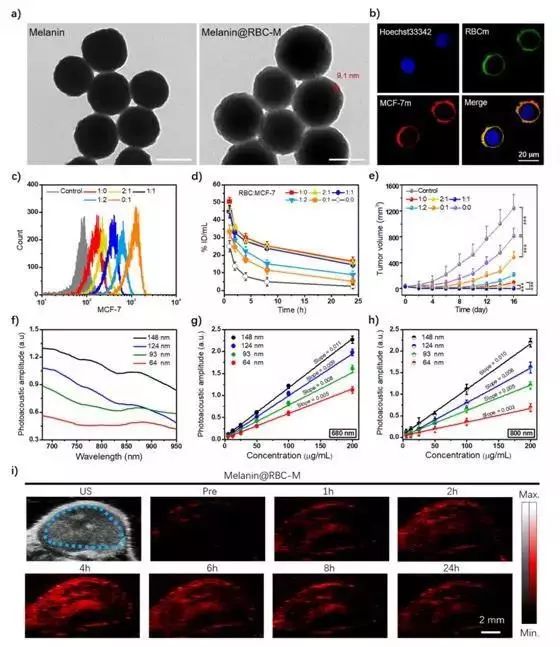 �D2 a) ����ɫ�ؼ{�����Ӻͼt����-�������s��Ĥ���µĺ�ɫ�ؼ{�����ӵ����u��ؓȾ�������R�D, �˳ߞ�100 nm. b) �����ٰ������ͼt����-�������s��Ĥ���µĺ�ɫ�ؼ{�����ӹ�������Ĺ��۽�����D, �˳ߞ�20 ��m. c) ��ͬRBC�cMCF-7Ĥ���ױ��ص�Melanin@RBC-M�{�����������ٰ������е���ʽֱ���D. d) �t����-�������s��Ĥ���µĺ�ɫ�ؼ{�����Ӻͼ���ɫ�ؼ{�����ӵ�ˎ�������W����. e) �t����-�������s��Ĥ���µĺ�ɫ�ؼ{�����Ӻͼ���ɫ�ؼ{�����ӌ�MCF-7�[�����������L. f) ��ͬ�ߴ�Melanin@RBC-M �{�����ӵĹ���̖�D�V. g-h) ��ͬ�ߴ�Melanin@RBC-M�{�����ӷքe��680 nm (g) ��800 nm (h) ���l���L�µĹ����ֵ�S�{�����ӝ��׃���������D. i) �t����-�������s��Ĥ���µĺ�ɫ�ؼ{������(i.e. 124 nm)���[����λ�ij���������.