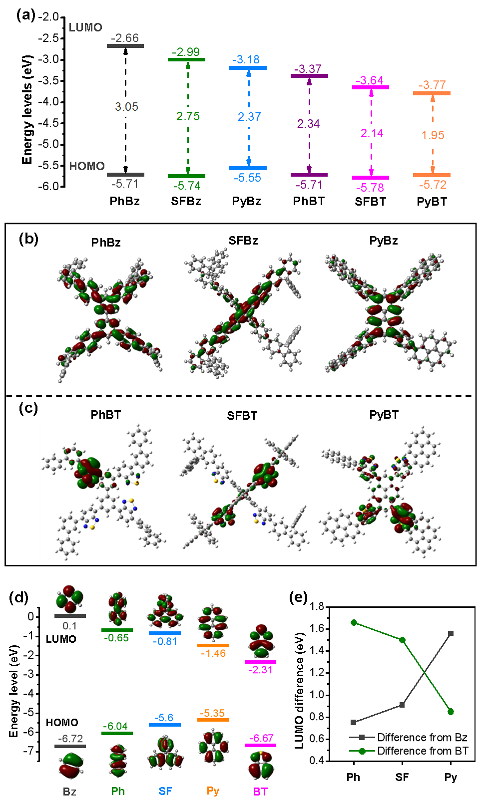 �D2. ��ܗ�ۺ���ģ�a���ܼ��ͣ�b, c��LUMO�ֲ�;��(g��u)����Ԫ�ģ�d���ܼ��ͣ�e��LUMO�ܼ���