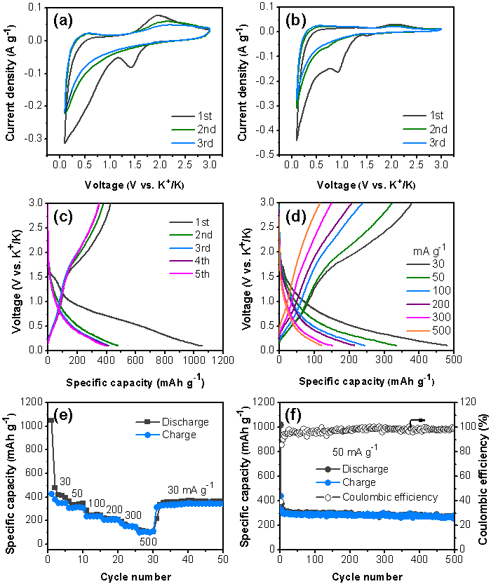 �D3. ��a��PyBT�ͣ�b��PyBzѭ�h(hu��n)��������; ��c��PyBT��30 mA/g����ܶ��µij�����������d��PyBT�ڲ�ͬ����ܶ��µij�����������e��PyBT�ı������ܣ���f��PyBT��ѭ�h(hu��n)��(w��n)����
