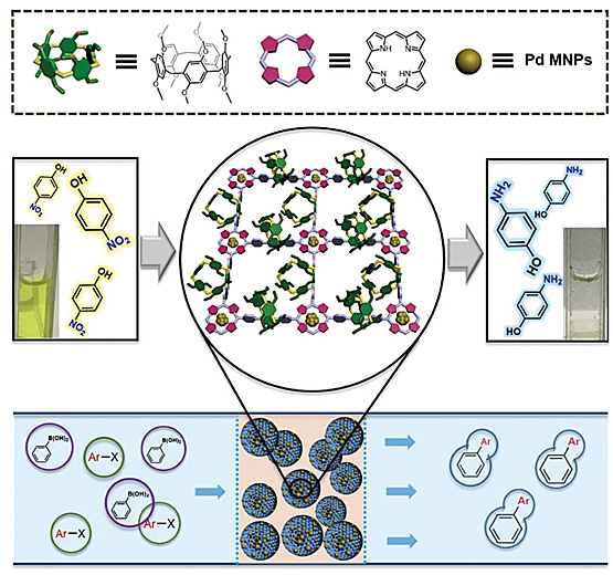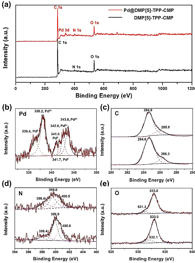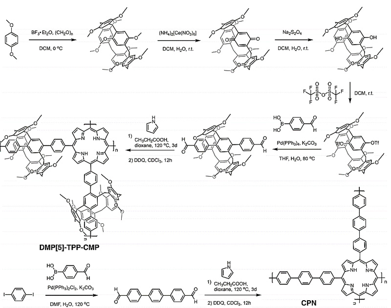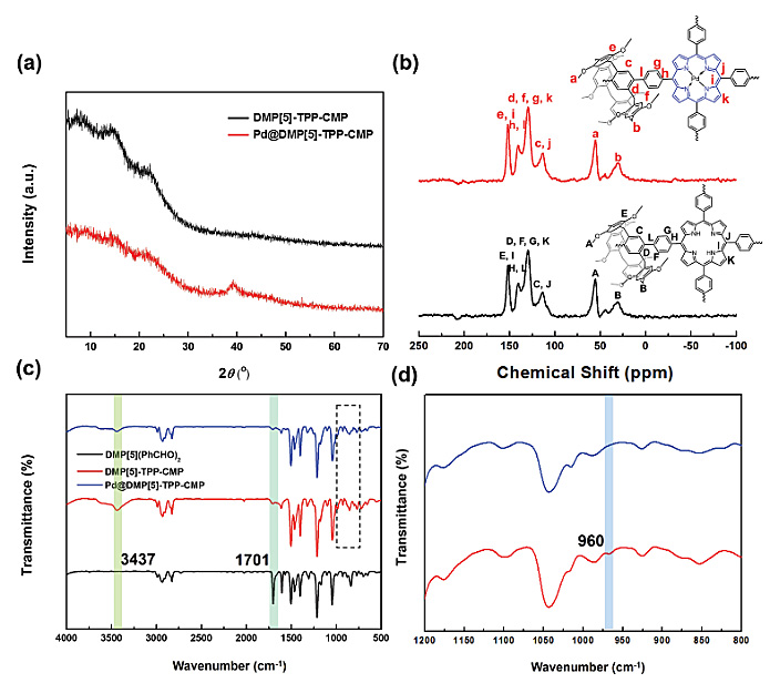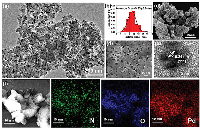 ���գ����ִ�W����Ӣ�������F��������ܲ��ϵĽY���OӋ�͑����_�l������������Ծ��_�{���Z�{�����ӳɺˡ����L������ܗ��h�ۺ������DMP[5]-TPP-CMP�����У��ɷN��ʹ�h���������N��߲��������Ҫ������Ԫ��ͨ�^���ϳ��^�����܄����ضȵ��{�����ɹ��Ƃ�õ�30 nm���ҵľۺ������ӡ��ڴ����Z�l���£���������Ĵ�h����Ч���Ƃ�õ�ؓ�d���Z�{�����ӵďͺϲ���Pd@CMP��������@����TEM���ͷ�ĩX�侀���䣨PXRD���Ȝyԇ��������DMP[5]-TPP-CMP�ϳɹ�ؓ�d�������ֲ���9 nm���ҵ�Pd�{�����ӣ�ͬ�r��X�侀��������V��XPS���ͼt����V��FT-IR���t����߲��N�������N�ɶ˹��܈F-OCH3�е�O��Pd����һ������λ���ã����߅fͬ�{��Pd�{�����ӵijɺˡ����L��ͨ�^�OӋ�����������N��h�Č��վۺ������ȡ��ͬ��ؓ�d���ԣ��õ��������ֲ���һ���^���Pd�{�����ӡ��ɴ˿����C�������h�ڽ���Pd�{�����ӵijɺˡ����L�^�̶����P��Ҫ��