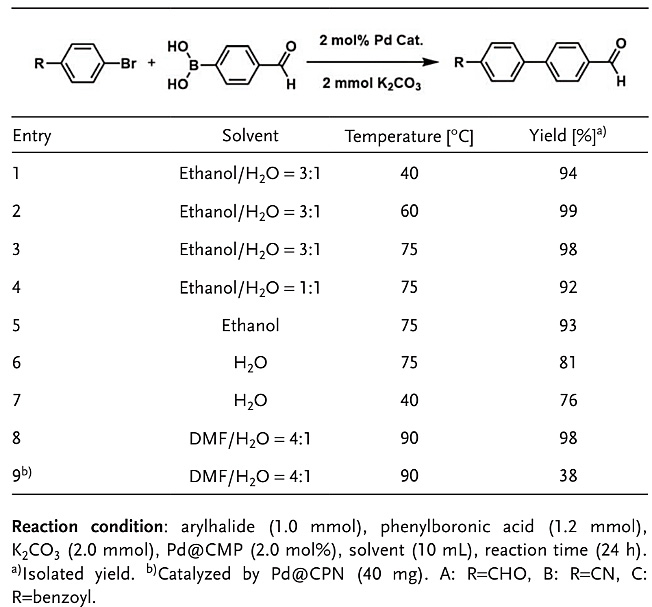 �˺��о��ˆT�yԇ��Pd@CMP�ڮ����Suzuki�CMiyauraż�B����������߀ԭ�����еĴ������Լ�ѭ�h�����ԡ���Suzuki�CMiyauraż�B�У��cͬ��wϵ��ȣ����܄��͜ض��ϲ�ȡ���^�غ͵ķ����l�������õ�������Įa�ʣ�99%��������������߀ԭ�У�Pd@CMP�Ը��ߵĴ������W���ʳ�����kapp = 1.9 × 10?2 s?1�����ڽ^����������Z�Ĵ����ϡ����^5����ͬ�Ĵ�ѭ�h�yԇ��Pd@CMP��ż�B��߀ԭ��������Ȼ�����������Ĵ����ܡ�ԓ�������H�OӋ���Դ�h����Ҫ������Ԫ������ܗ��h�ۺ�����ϣ�ͬ�r�C�������ڮ�����I��ľ��Ý����������;Gɫ���ܲ��ϵ��OӋ�ϳ��ṩ����˼·��