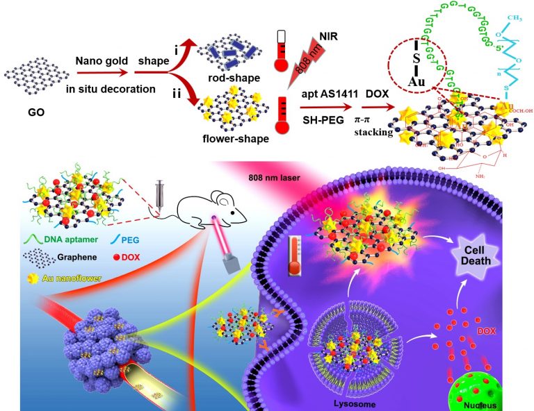 �R�ʴ�W�ܺ���ں͏���ʥ�����n�}�Mᘌ�Ŀǰ�����ϵĹ���D��Ч�ʲ��ߵȆ��}�����{��ԭλ���������ʯīϩ���棬�ϳɵļ{�ͺϲ�����808nm�ļ��������£�2��犃Ȝضȿ��Կ�����ߵ�85 �棬���F���˷dz��õĹ���D�Q��������ԓ�����У��о����Mһ��ͨ�^�ڹ��{�ͺϲ��ϱ�������Ҷ�����PEG������������������ص��m�wDNA-AS1411���Լ����[��ˎ�ﰢù�أ�DOX��������˼{�ײ��ϵķ����ԡ������Բ����F�������ٰ���ģ�͵İ��W/���fͬ�[���ί���