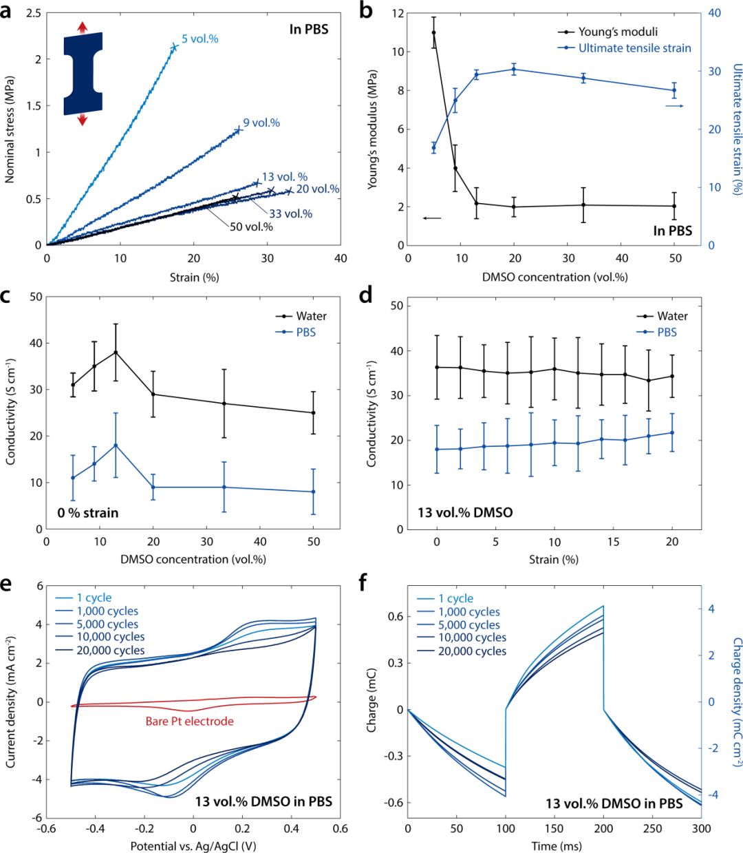 ���W�yԇ�Y�����D3��������PEDOT:PSSˮ���z��֧�α�Ĥ�����ᾏ�_�}��Һ��PBS���еė���ģ����2~10 MPa���c���Ï����w��PDMS���ஔ����Ŀǰ��������O���Б��õĂ��y늘O���ϵ�6~9�����������c���w�M�������Wƥ���Դ����ߡ�PEDOT:PSSˮ���z�Ĕ��������ʿ��_40%�����@���ڸ����PEDOT:PSS��Ĥ��10%�����c���w�M�����������ܸ���ƥ�䣬�����M����20%����Ƥ�w��50%���ȡ�ͬ�r��PEDOT:PSSˮ���z���кܸߵ�늌��ʣ���ȥ�x��ˮ�и��_40 S/cm��PBS��20 S/cm������Ŀǰˮ���z늌��ʵ����ֵ֮һ��늘O�����W�о��@ʾPEDOT:PSSˮ���z늻��W�������ã��ҷ����ԃ�����ѭ�h��������20000Ȧ늻������ܱ���90%���ϡ�늺ɴ惦��CSC����ע��������CIC����������ӑ��õ���Ҫ������PEDOT:PSSˮ���zCSCֵ���_60 mC/cm2��CICֵ��8.3 mC/cm2���܉�M���X�C�ӿڡ��˙C�ӿ�늘O������������Ҫ�����w�ϣ���PEDOT:PSS���ˮ���z��߸�늌��ʡ��������ԡ��͗���ģ���Լ����������W��늌W�����ԣ��D3�����錍�F�����܌��ˮ���z�IJ����_�l�ṩ���µ��OӋ˼·��
