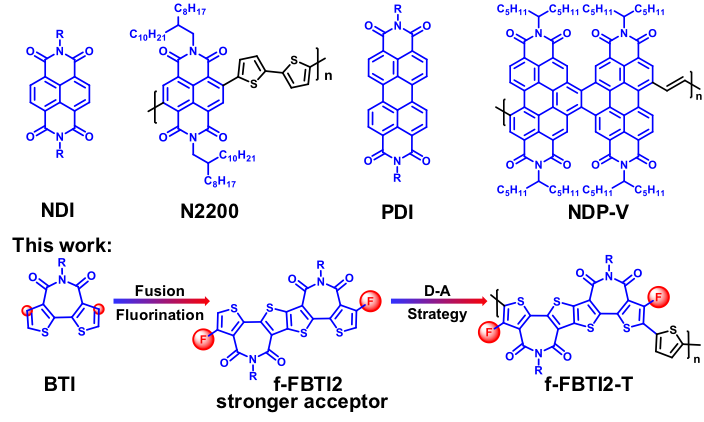 ������һֱ�����ڰlչ���������������������ЙC�댧�w��2008���Ƃ����ׂ�����NDI�Ĺ�ܗ�ۺ�����^ʮ����lչ��NDI�ۺ���F�ѽ��ɞ���ɹ���N-�߷��Ӱ댧�w��ȡ���˘O�䃞���ľ��w�����ܲ����������ȫ�ۺ���늳ص�Ч��ӛ䛡�������ͬ�r�����о������������w���������һ����Ҫ�ɆT���p���������(Bithiophene imide, BTI)����������һϵ�л���BTI�ľۺ���댧�w(J. Am. Chem. Soc. 2011,133,1405;J. Am. Chem. Soc. 2012,134, 18427;Adv. Mater. 2012,24, 2242; Nature Photonics 2013,7,825;J. Am. Chem. Soc. 2014,136,16345;J. Am. Chem. Soc. 2015,137,12565)���cNDI��PDI��ȣ�BTI���и��ߵĻ��W���Ժʹ���ȜpС��λ�裬�Ķ��ṩ��һ��ǰ��δ�еęC������Y���M����չ��������ǰ�ڹ����У������ڈF����ó��h���Գɹ��ϳ���һϵ��(��)�����ЙC�댧�w�����ھ��w�ܺ�ȫ�ۺ���늳���ȡ���˿ɱ���NDI��PDI�ۺ������������(Angew. Chem. Int. Ed. 2017, 56, 9924; Angew. Chem. Int. Ed. 2017, 56, 15304; J. Am. Chem. Soc. 2018,140,6095.)�����ǣ���������ڱ��h���������,��һ���̶��Ϝp���˰댧�w������H���������ͨ�^����ӻ��F���ܻ�BTI���H���a��������������w���w,ͬ�r߀�ܽ�QNDI��PDI�Y���ϵ�ȱ�ݡ����ڴˣ������ڈF˷��˺ϳ��ϵ����𣬳ɹ��Ƃ���·f�ķ�ȡ��������������ۺ���댧�w����ՓӋ�����,�����ڛ]�з��Ć��wf-BTI2,��ȡ���Ć��wf-FBTI2���F�����͵��ܼ��������������ۺ����N-�����ܡ�