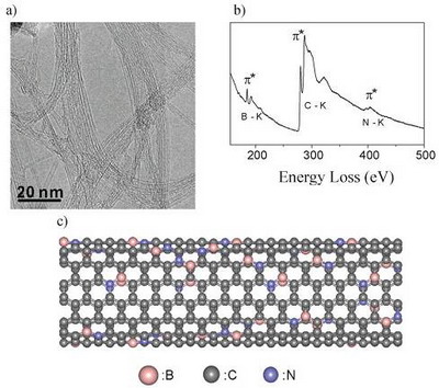 ԓ�о��M���ø��M�ĵ��x���o����z���W������e(CVD)���L���g�����F�ˆα�̼�{�ܵ�B��N�����s��������Ԫ���rBCN������{��[J. Am. Chem. Soc. 128, 6530(2006)]���^�@��о��ɹ�������������@�NB��N�����s�{�ܘ����˴����Ĉ�Ч�����w�ܣ�����늌W���|�M���˽yӋ�Է����о����Y��������ͨ�^���α�̼�{�ܵ�B��N�����s����Ʒ�а댧�w�Լ{�ܵı�����67%�������������97%���������������@һ��Ҫ���l�F���������õ�һ��ԭ����Ӌ���˓��s���α�̼�{�����Y�����{�����á��Y���C����B��N�����s����ʹ�����ԵĆα�̼�{�ܵ���϶�����_��ʹ���D׃��댧�w�Եļ{�ܣ���B��N�����s������׃�댧�w��̼�{�ܵČ�늌��ԣ��Ķ�����Փ�Ͻ����B��N�����s�{��̼�{�����Y��������C�ơ�B��N�����s�ǽ�Q�댧�w�Ժͽ����Լ{�ܲ��ɷֆ��}��һ�l��Ч����;����