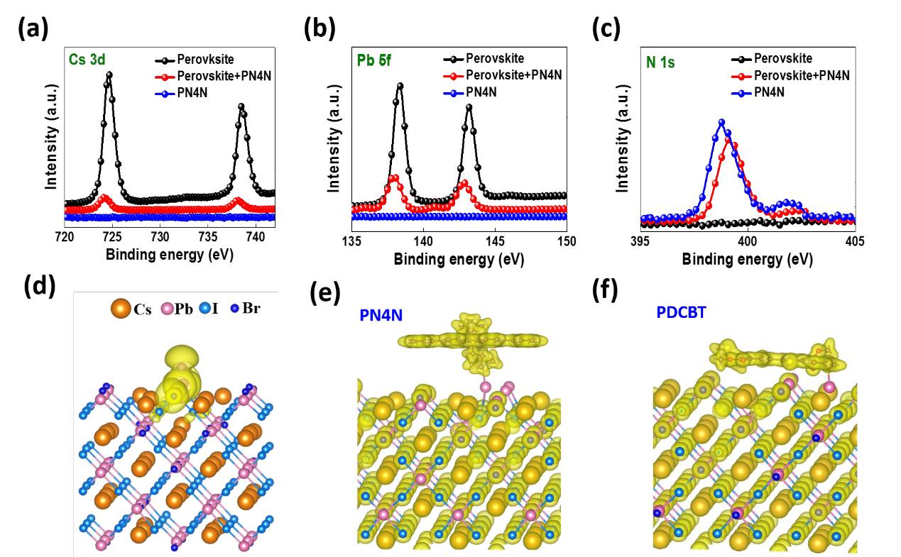 �D3. ��a��Cs 3d����b��Pb 4f�ͣ�c��N 1s��CsPbI2Br��CsPbI2Br/PN4N��~8nm����PN4N��Ĥ�е�XPS���V��DFTӋ���CsPbI2Br������Ә��ͺ�PN4N��PDCBT��ȱ�ݑB�g��Ч������d�����з�λȱ�ݵ�CsPbI2Br��110�������늺��ܶȷֲ��D;��e��PN4N�ͣ�f��PDCBT��CsPbI2Br��110���ϵı����g����λȱ����