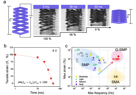 ���գ����߳����ڡ��S����Ƹ�о��T�F��c�R�н��ڈF����������߹�ͬŬ����ͻ�����@һ푑��ٶ��y�}��ԓ헹����Ը߶ȿ������ʯīϩ�����z��ģ�壬����Ȳ������ɾۼ�������polycaprolactone��PCL���{�ױ�Ĥ��2.5-60nm������ɵ��Π�ӛ���W�j�����У�ʯīϩ�{�W�j������������D�Q������ע��ͨ����PCL�{�W�j��������������f����׃�d�w���@�N����PCL/ʯīϩ�����W�j�Y���Ě����z�{�ͺϲ��������̖�̼��£�푑��r�g�H��50���룬푑��ٶȿ��_175��40 mm s-1�������׃�s100%��ԓ�����ԡ�Millisecond Response of Shape Memory Polymer Nanocomposite Aerogel Powered by Stretchable Graphene Framework�����}�l����ACS Nano �ϡ�