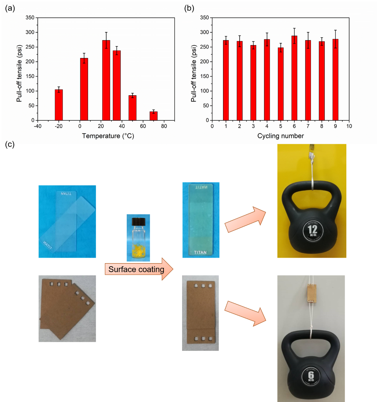 Figure 3. Quantitative adhesion experiments involving (a) II-water adhesion at different temperatures and (b) cycling tests of II-water adhesion. (c) Macroscopic adhesion tests of II-water adhesion on glass and paper. The adhesion areas are 7.5 ×7.5 cm2 and 4.0 ×3.5 cm2, respectively.