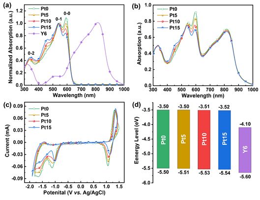 Figure 2. (a) J-V curves of the NF-PSCs. (b) EQE curves of the NF-PSCs. (c) The DEQE of Pt10 devices with respect to Pt0 devices. (d) The absorption difference of Pt10:Y6 blend film with respect to Pt0:Y6 blend film.