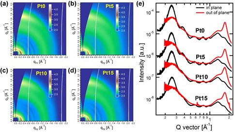 Figure 3. (a) 2D-GIWXAS patterns of the polymers. (b) The in-plane and out-of-plane line-cut profiles.