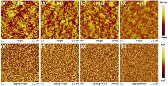 Figure 4. AFM height images (a-d) and phase images (e-h) of the polymer:Y6 blends.