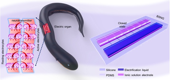 �Ї��ƌWԺ�����{����Դ�cϵ�y�о���������Ժʿ�������о��T�I�����о��F��c�����������t�W���̸߾������Ľ��ڷ�褲������о��F���������һ�N������Ŀ�����l늙C��BSNG, bionic stretchable nanogenerator������������ˮ�����c�����ռ���ԓ�������о���ģ������l����ټ���Ĥ�ϵ��x��ͨ����������һ�N�Cе�����Եķ���ͨ�������ڿ��ưl늙C�Ȳ������Һ�w�������\�ӣ��Ķ����F��ܵ��D�����ɷN���صĹ���ģʽʹ��BSNG��Һ�w�h���п��Ԍ��F���^10V���_·늉����ڸ���l���¿��Ԍ��F���^170V���_·늉���BSNG�������ɫ�����g�����������ԡ��Cе푑��Ժ�ݔ�����ܵȃ��������������w�\�ӱO�y���ڸ����Һ�w�h���О���һ���ɴ�������O���ṩ��һ�N��ǰ��������Դ��