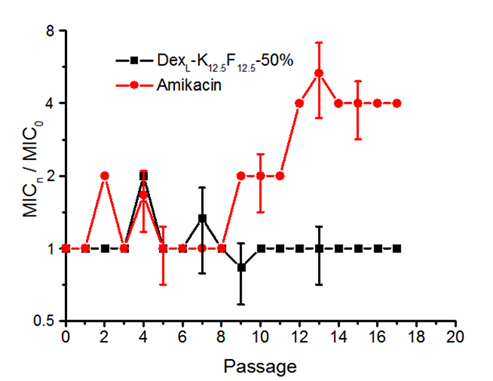 �D3. �ͼ������ֽ��Sɫ���������MRSA���ڶ��MIC��¶����ͬ�������|�������ǡ�DexL-g-K12.5F12.5-50����MIC��׃����������Biomacromolecules��