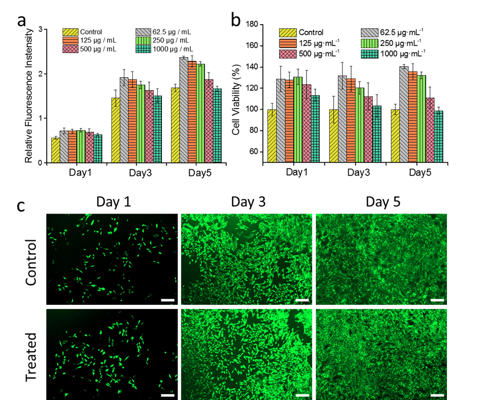 �D4 �w�������������о���a��������ֳԇС��ɼ�������C2C12���ڲ�ͬ������DexL-g-K12.5F12.5-50�����������B1��3��5�죨b�������ڌ��սM�Ļ����ٷֱȣ���c��DMEM�����գ�����1000 ��g·mL-1 DexL-g-K12.5F12.5-50�������·�����С��ɼ�������C2C12���ڵ�1��3��5���LIVE / DEAD�ɹ�D�����ߣ�200��m����������Biomacromolecules��