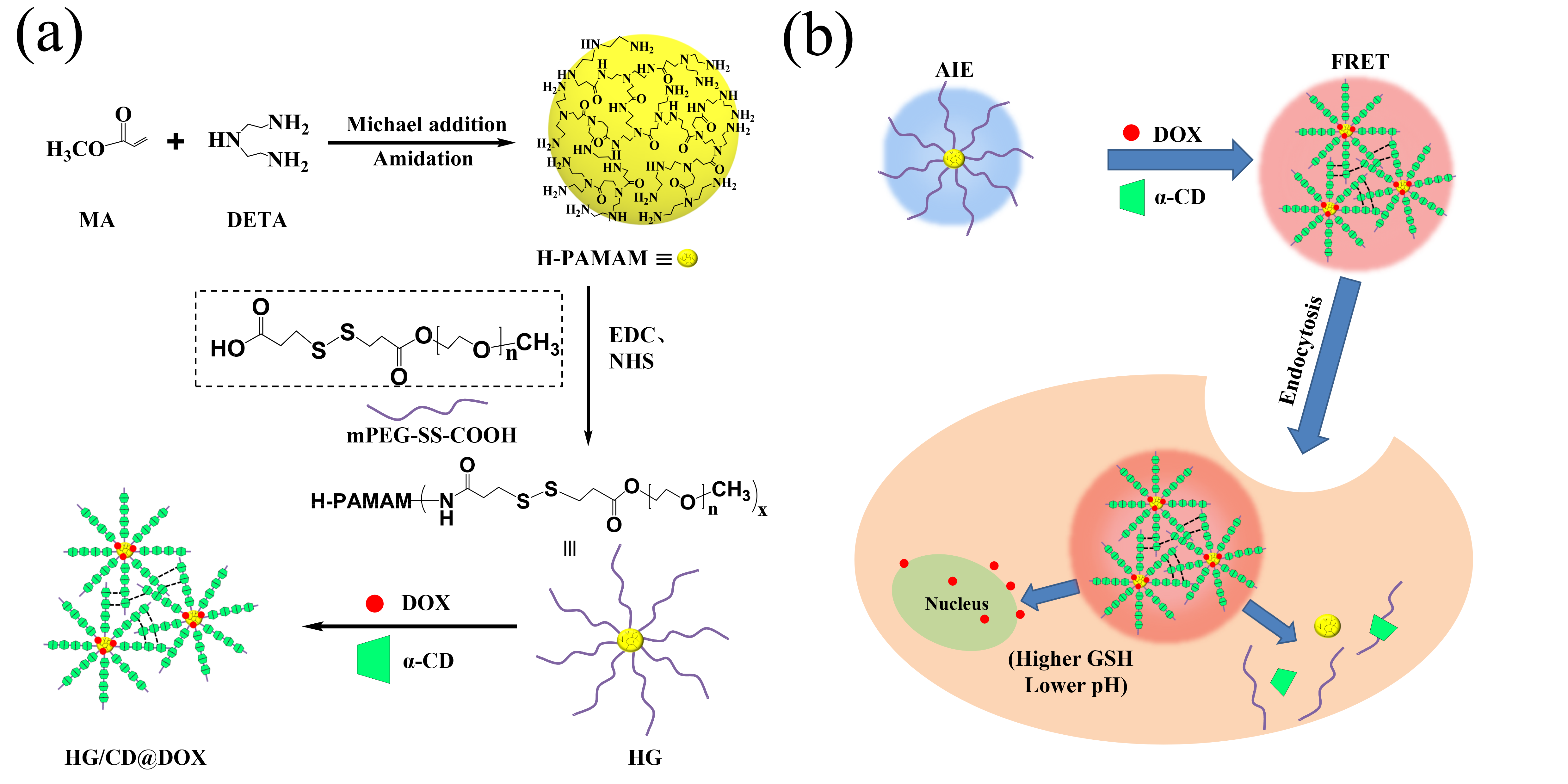 �����츱�����n�}�M�����ڳ�֧������������H-PAMAM���ɹ���(g��u)����һ�N����AIE��FRETЧ��(y��ng)�ij����Ӽ{���dˎ�wϵHG/CD@DOX���Ծ��б���AIEЧ��(y��ng)��H-PAMAM�������ͨ�^(gu��)��������������������Ӿ��Ҷ�����Ȼ��ͨ�^(gu��)���Ҷ����ͦ�-CD�������w����ã���(g��u)�����ɾ���AIEЧ��(y��ng)�ij����Ӽ{���w������ؓ(f��)�d����ˎ��DOX�������ӽM�b�w�����S����֧���Y(ji��)��(g��u)�γɵĿ�ǻ���܉���������DOXؓ(f��)�d������֧������H-PAMAM�������õğɹ�����������AIE��H-PAMAM��DOX֮�g��FRETЧ��(y��ng)���Ԍ�(sh��)�F(xi��n)ˎ���(d��ng)�B(t��i)܉�E����(d��ng)�B(t��i)�ˎ�ıO(ji��n)�y(c��)�������������I�������Լ�H-PAMAM��pH������ʹ���܉����[��̎��(sh��)�F(xi��n)ؓ(f��)�dDOX�Ŀ����x����ጷţ���������������r�±��ַ�(w��n)�����w�⼚(x��)�����Ա����dˎ�����ӽM�b�w��(du��)���Y�������õ��ί���Ч����H-PAMAM���IJ�ͬ�ڂ��y(t��ng)��AIE���ܻ��F(tu��n)�������ڱ��h(hu��n)�ȹ�ܗ�Y(ji��)��(g��u)�����и��õ����������ԣ����������͵�ˎ���f��ϵ�y(t��ng)����(hu��)�ЏV韵đ�(y��ng)��ǰ����