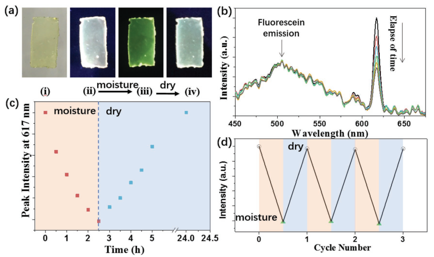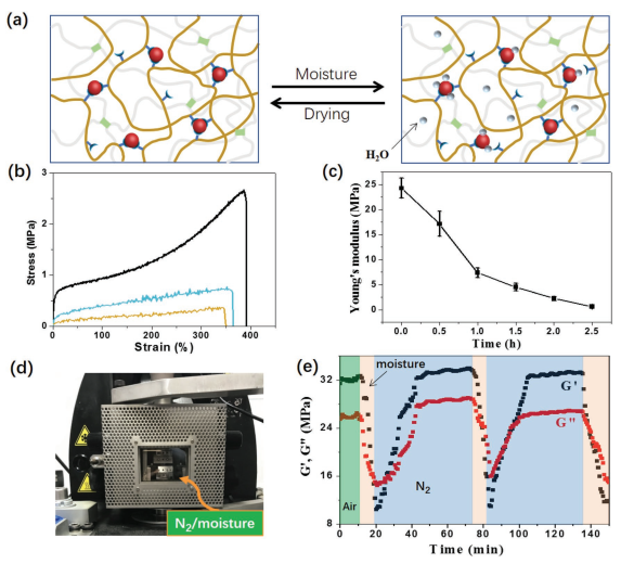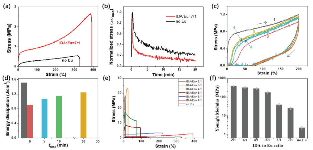 ᘌ����ܲ��ϵĹ�W�c���W���ܿ������푑��@һ�о�ǰ�أ�������W�̸����������c���������Ҹ��W�νܽ��������ڡ�Advanced Functional Materials���l����һƪ�}�顰An Adaptable Tough Elastomer with Moisture-Triggered Switchable Mechanical and Fluorescent Properties�����о�Փ�ġ�ԓ�о����ڈF�ǰ����Eu-IDA�������������ᣩ�ӑB��λ�{�ؾۺ���ˮ���z�Ķ��؟ɹ�ɫ��푑�����ijɹ���Advanced Materials, 2018, 1706526�������ütɫ�ɹ�l���Ե��|ϵ�����x�ӣ��B��Eu3+���c��IDA���w�ľ�2-(2-����������)����ϩ������ͨ�^�ӑB��λ���Ø�����һ���������W�j��Ȼ������������һ�ع��r���W�j����K�õ���D1��ʾ���g�ԝ�ȴ̼�푑������w��