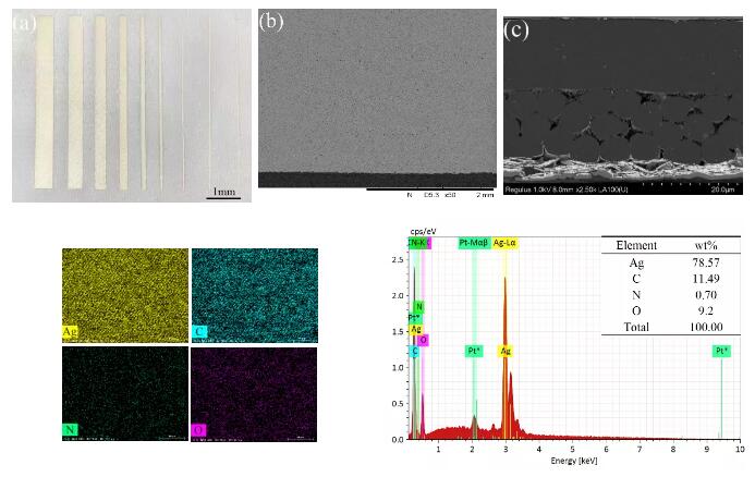 �D2. (a) ���\�]�����Ͻz�W(w��ng)ӡˢ��ͬ���ȵČ�늾��Ĺ�W�D��(b) �̻���늾��⻬�Ҿ���߅����SEM�D��(c) ӡˢ��늾�����SEM�D��(d)�̻���z�W(w��ng)ӡˢ��늾���Ԫ��ӳ��D��(b)������ӡˢ��늾���EDS���V