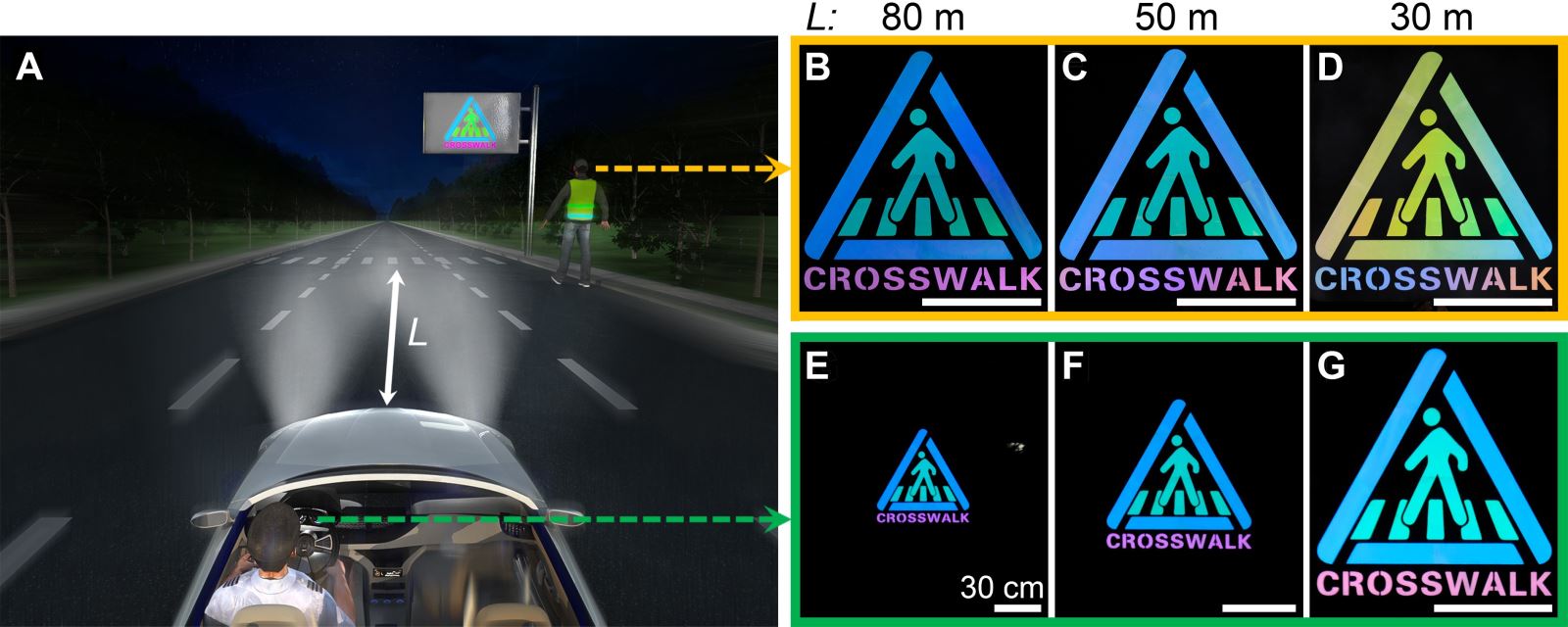 �D2.��A���淴��Y(ji��)��(g��u)ɫ��Ĥ�Ƃ�Ľ�ͨ�����(bi��o)����ҹ�g��·�ϑ�(y��ng)�õ�ʾ��D���Լ�܇�v���x��(bi��o)�Ʋ�ͬ���xL�r(sh��)��80�ס�50�ס�30�ף���B-D������ҕ�Ǻͣ�E-G��˾�C(j��)ҕ�ǵ���Ƭ��