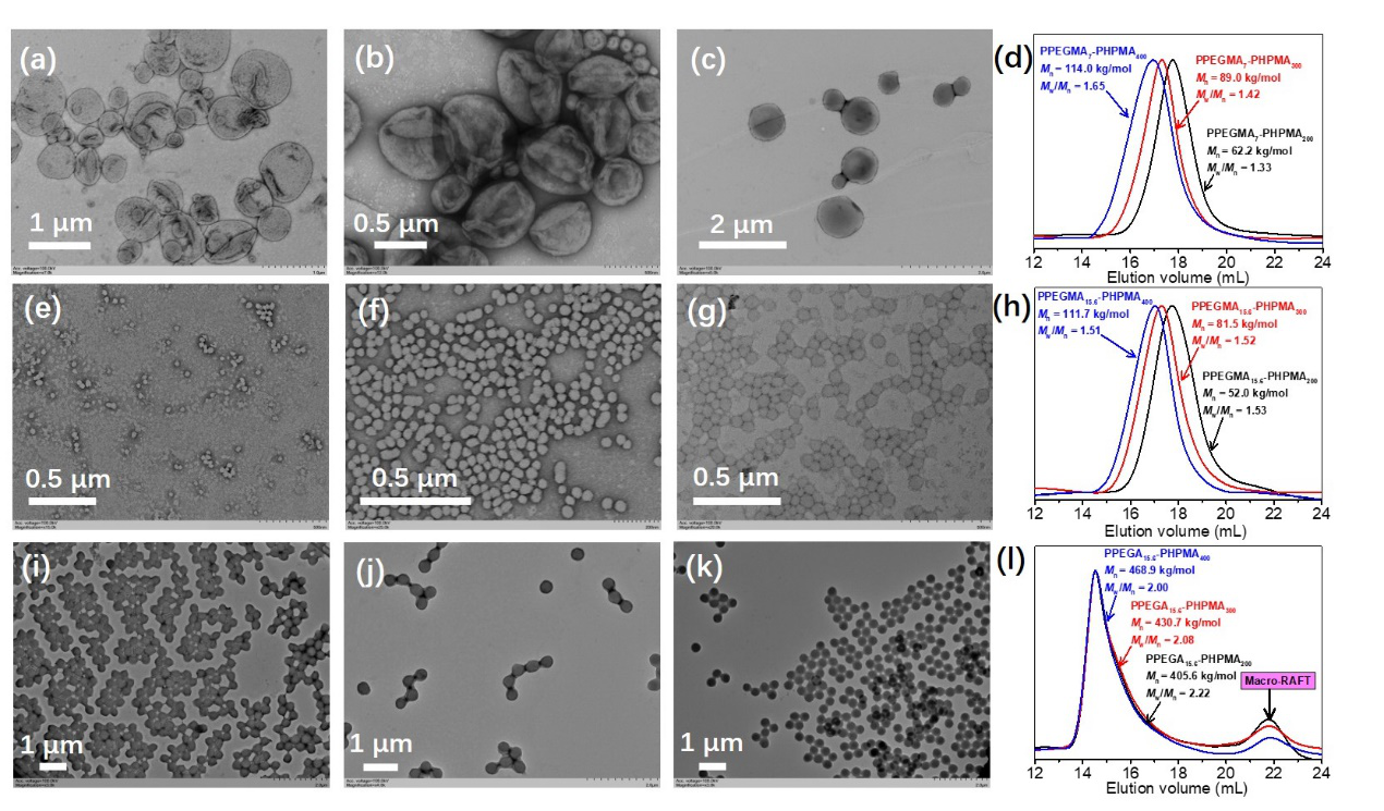 �D2. ͨ�^(gu��)photo-PISA�Ƃ�PPEGMA7-PHPMAn��n = 200, 300, 400���M�b�w��TEM��a-c���cGPC��d����ͨ�^(gu��)photo-PISA�Ƃ�PPEGMA15.6-PHPMAn��n = 200, 300, 400���M�b�w��TEM��e-g���cGPC��h��; ͨ�^(gu��)photo-PISA�Ƃ�PPEGMA15.6-PHPMAn ��n = 200, 300, 400���M�b�w��TEM��i-k���cGPC��l����