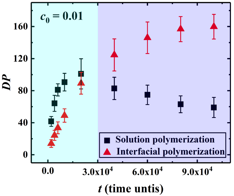 ᘌ�һ������ij����ӽ���ۺ��wϵ����ˮ���Ԇ��wMA-C12�������Ԇ��w (UPy-SH)2֮�g�l���ij����ӽ���ۺϷ�����Angew. Chem. Int. Ed., 2017, 56, 7639����ϵ�y�о��˷����^�̵ğ����W�̈́����W�����������о��l�F���ڷ����ij�ʼ�A������������Һ�ۺϷ����ľۺ϶��������@���ڽ���ۺϷ������@��������Һ�ۺϷ����l���ڳ����Ӿۺ��������������L�ĭh���������֮�£�����ۺ�ֻ���ڽ���̎�l�����������Ӿۺ�������L�����ڽ��渽���^խ�ķ����������ڷ������к���������ۺϵľۺ϶���Ȼ���Գ��m����������Һ�ۺτt���pС����D2��ʾ�����@����������Һ�ۺϵ��к��������^�͵Ć��w��ȕ�ʹ�ɭh����������ʹ�þۺ϶Ȝp�������ڽ���ۺ��wϵ�У����x�Ć��w���m�Uɢ�����渽����ʹ�ó����Ӿۺυ^��ĝ�ȿ��ԾS������˾ۺ϶ȳ��m���ӡ��@һ�Y���c������^�쵽��Ҏ�ɴ����Ǻ���