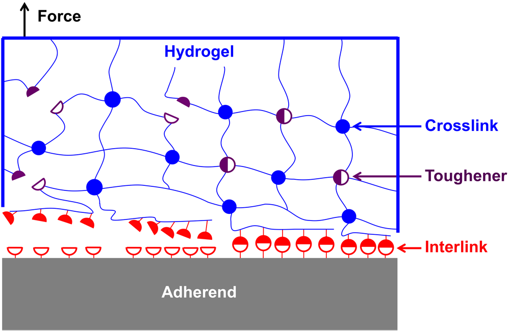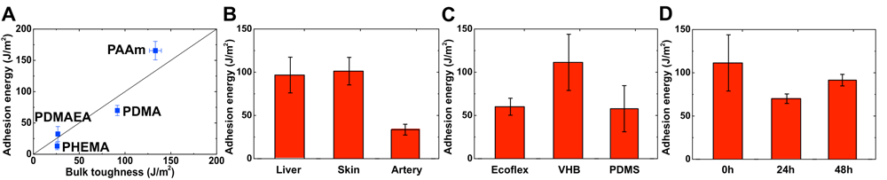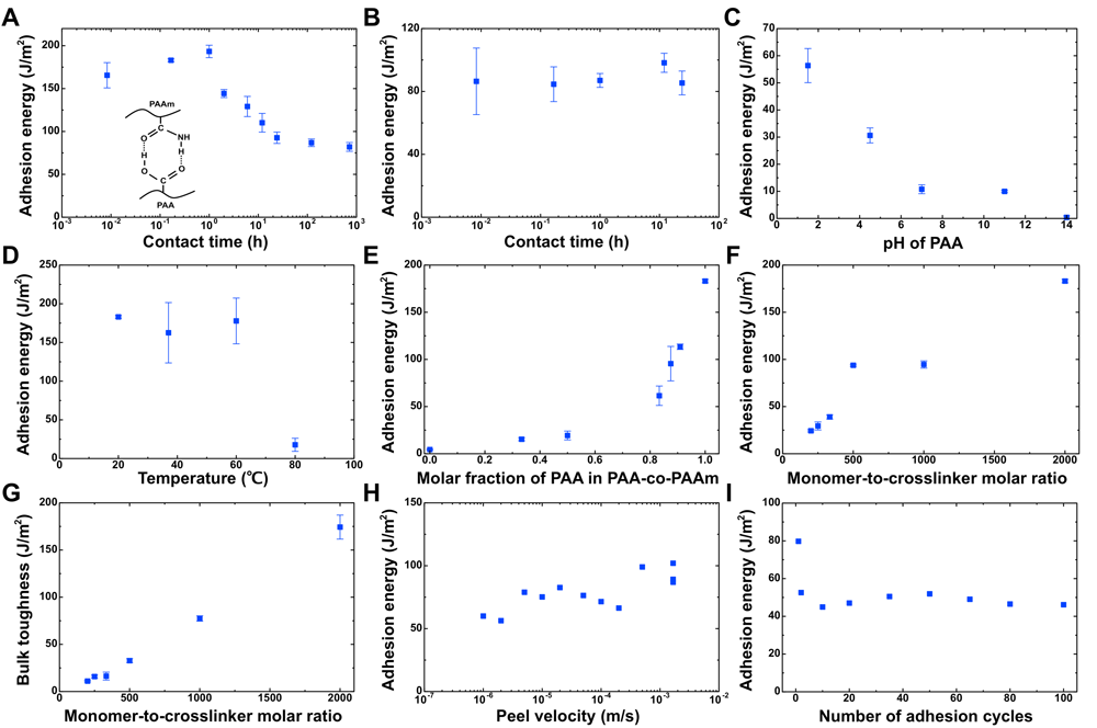 ���������˱����ǹ��rճ�ӿ��Լȿ����֏��g���о��ˆT�քe��PAA��PAAm������ǽ���PAA�L机��}-�������c��Ca-alginate���ͺ����������g���ӣ�ͬ�r������PAA��PAAm���D4A���������Mһ�����������ӣ�alginate-PAAm�g��ˮ���z��pH���O����4.5����D4B ��ʾ��ճ�ӿ�����30��ȿ����γɣ���ճ���ܳ��^��750 J/m2��