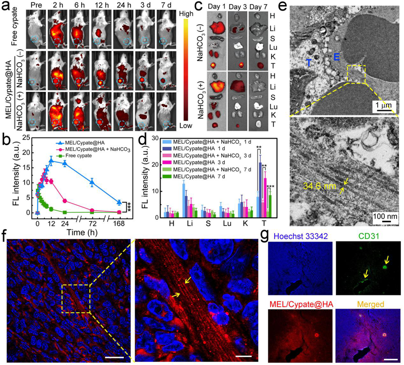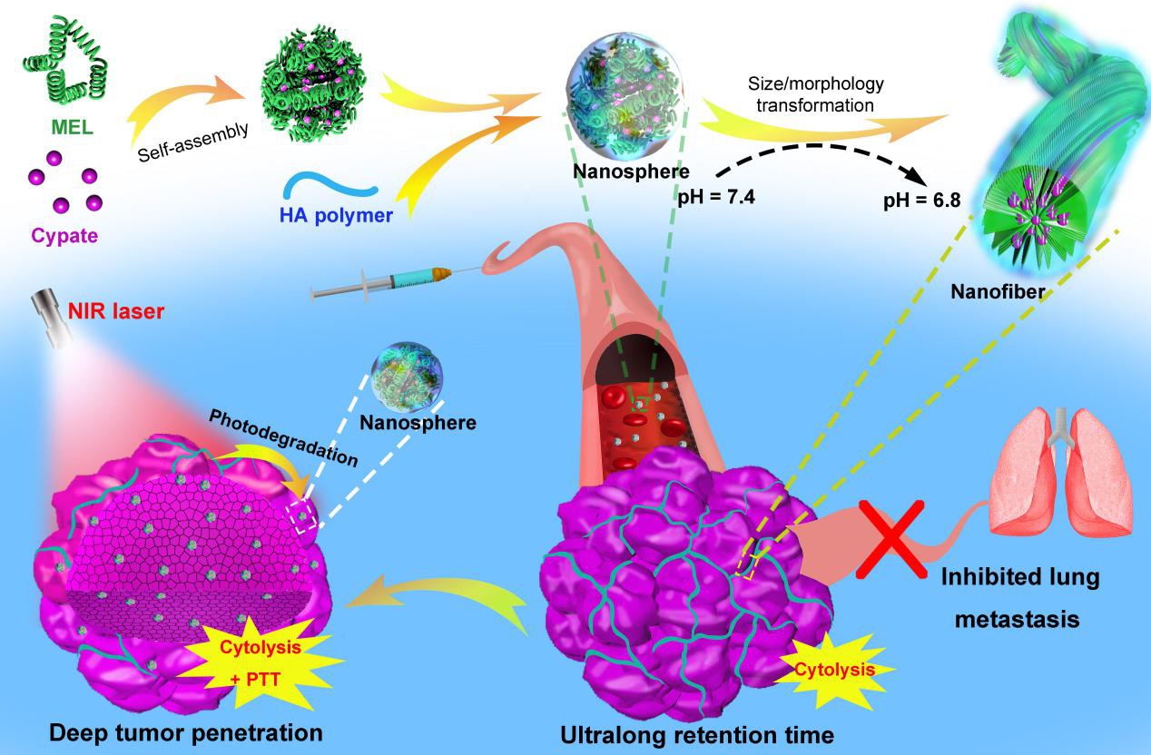 ��ǰ���|�ϴ�W����ƌW�c�t�W���̌WԺ��������ӌW�������c����ҵ��Ǹ��������n�}�M�lչ��һ�N�ߴ�ͽY����׃���p��푑��{��ˎ�ԓ�{�ײ����ɼ����ѽ���melittin���䶾�ģ������t�������cypate�;����[���������������|�ᣨHA���߷���ͨ�^�ԽM�b�γɡ���pH 7.4�h���У�ԓ�M�b�w�������s50 nm�ļ{�����@�����ڌ��F�{��ˎ����ѪҺ�е��Lѭ�h�����خ��������[���^��r���@�N�{��ˎ������������ԭh����~pH 6.8�����|�l�ļ{����ԭλ�D׃��{���w�S���@������L��ˎ�����[���M���ȵĸ����r�g�����⣬���P���Y��߀�C����ԓ�{���w�S���γ��܉����ư��������w�ƺ����u���Ķ���Ч�������[����β����D�ơ��Mһ���ģ�ԓ�n�}�M����cypate�Ȼ�ݼ����װl���⽵������c��ͨ�^���[���^��ʩ�ӽ��t�����ʹ�ü{���w�S����׃�؞�{����~25 nm�������F�˼{�Y���Ŀ����D׃���w�Ȍ��Y���@ʾ�����t�����̎�����H�O��������ˎ����[������ȣ�����չ�F�����õĹ������Ч�����_����ԓ�{��ˎ�ԭ�l�[���M���ďص������