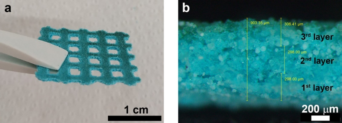 �D2. ��ӡ�ľ���10 wt%�b�d�Լ�2 mm×2 mm�W(w��ng)��D��������HKUST-1-PA12�K����ϣ���a����Ƭ�ͣ�b���M������@��Ƭ��