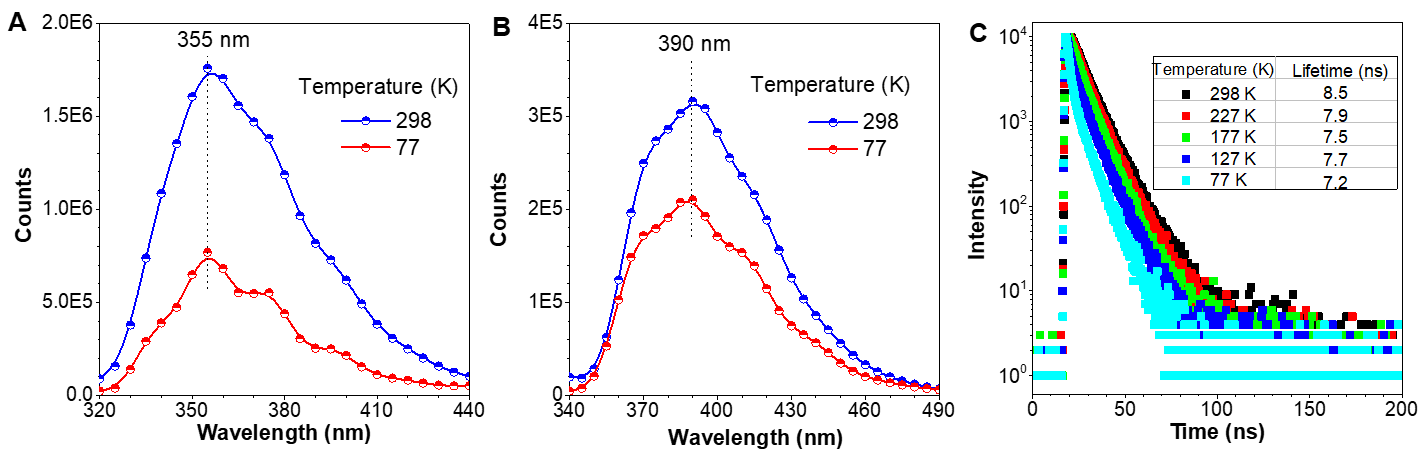 �D6. (A) s-DPE�� (B) s-DPE-TM �ڹ̑B�µĜض���ه�l���V�D��(C) s-DPE-TM�ڲ�ͬ�ض��µğɹ�˥�p�����Լ��ɹ����׃����