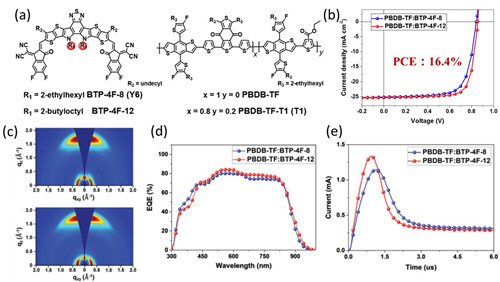 �D1 ��a�����ӽY������b��J-V��������c��PBDBTF:BTP-4F-12�wϵ��2D GIWAXS�D����d��EQE�������ͣ�e��photo-CELIV�yԇ�Y��