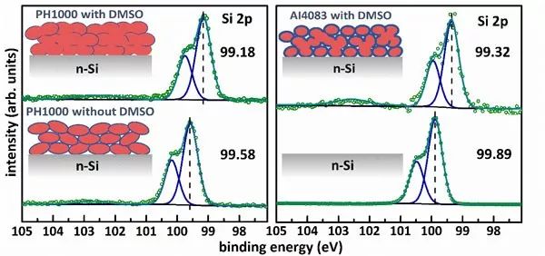 ���գ��K�ݴ�W�O��ȫ���ں�Steffen Duhm���ڈF������ֺ鱤��WNorbert Koch���ڈFꠣ�����ͨ�^��������V�x(XPS)��ֱ�ӵõ��ˌ�늾ۺ��ﱡ�Ӹ��w֮�������ϱ��T���a������������С���M���C����N-����ױ����ϴ_���Џ����͌�(P-�͌�)�ij��F���c�����īI����ĽYՓ���Ǻϣ���һ������Ҫ�����ⲿ�x�ӓ��s��P-N�Y�a����N-����棬���F����ӿ�Ѩ����Ч���x����ȡ��ͨ�^�����Ϳ�x���D�ٲ�ϡጌ�늾ۺ���ԭʼ��Һ(PEDOT:PSS)�ķ�ʽ���p���F��Ƃ��˺�ȵ���5nm��һϵ�б�Ĥ�����F�ˌ��ײ�����a���Ĺ���ӵ��ռ������������������С�ī@ȡ�^�����£����ȣ�̽�y�����o���w���N-�����XPS-Si2p��̖���õ�о���ܼ�Si2p3/2��ĽY���ܣ����酢����Ȼ��̽�y���w��늾ۺ���֮���N-�����XPS-Si2p��̖���õ��˘�Ʒо���ܼ�Si2p3/2��ĽY���ܡ����ȃ��߽Y���ܵIJ�e�����ɫ@��N-������ϵ���������С���M�������Д��Пo���ҷ��͌��γɡ��p���F�߀�l�F�������ЙC�܄�DMSO�����H������߱�Ĥ�Č���ʣ�߀�������Si2p���ƫ����������ζ�����T���a�������������ȵ�����������ԭ��Һ��PEDOT�������������������ķ��Ƚ�������D2��ʾ��