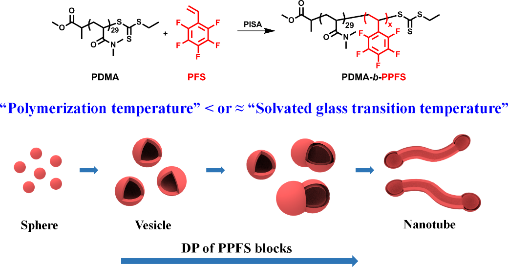 �������ڴ˻��A�ϣ��^�m�x�ú������wPFS�����о�����ʹ�þ�N,N-������ϩ������PDMA29�������H�܄�Ƕ�Σ����Ҵ��з�ɢ�ۺ�PFS���@��PDMA-b-PPFS�z�w�w����ͨ�^�{��PPFSǶ�ξۺ϶Ⱥ��܄�(DMF)�ı������ɹ��@�þ��м{����ò���z�w�w����ͨ�^��ͬ�ۺ��A�ε�ȡ�Ӹ�ۙ�о�����ʾǶ�ξۺ��{�v����-����-�{�ܵ���ò��׃�^�̡�Ȼ��������������ǣ������܄�DMF�ĺ����^��(20%)�r�������l�FǶ�ξۺ������ò�D���^�̰l�����@����׃�������v���y������-���x��-����-�ͺ����ݵ���ò�D׃�^�̡�