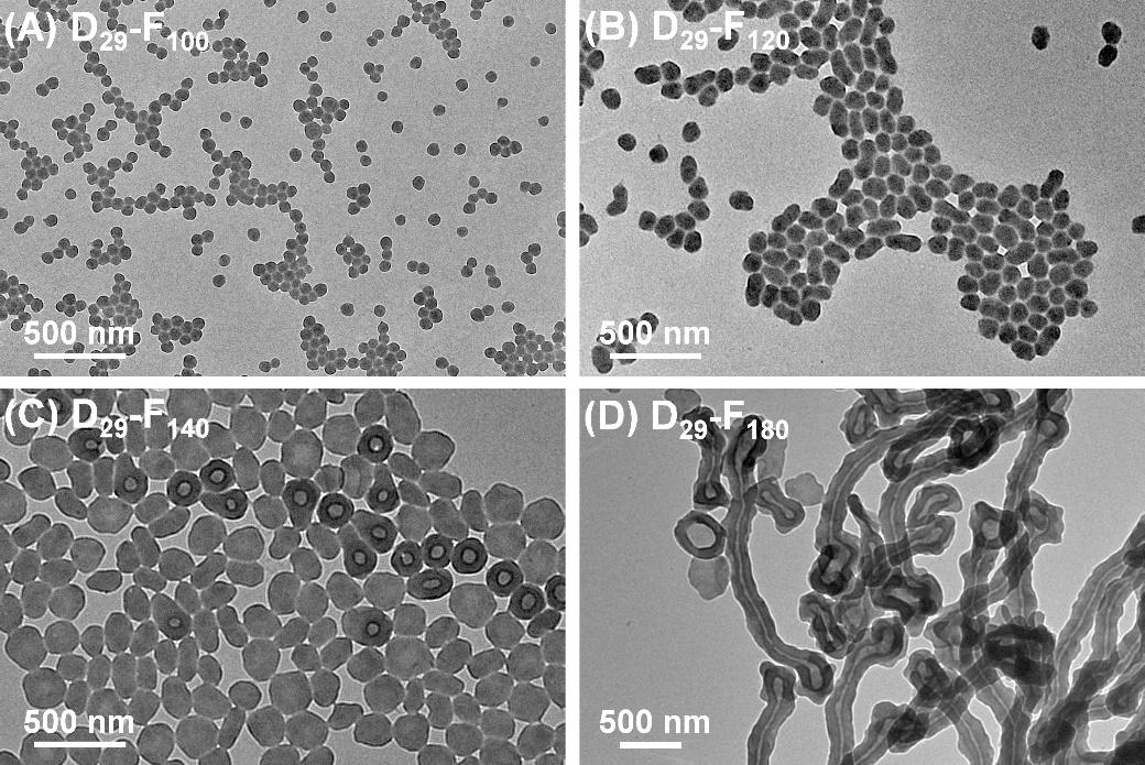�D3. ��30% w/v���w������20% DMF/�Ҵ��У�70 ���l�����Ƃ�PDMA29-b-PPFSx�z�w�w����TEM�D��