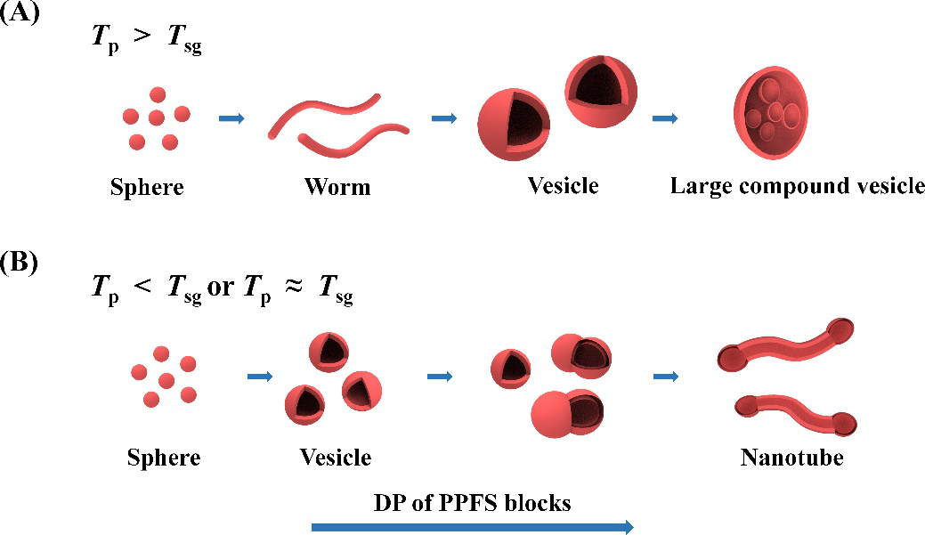 ���@һ����F���������ó��`����ʾ��������x����ͬDMF�����µ�Ƕ�ξۺ����M���܄����������D׃�ض�(Tsg)�Ĝy�����Y���������S��DMF���������ӣ�PDMA-b-PPFS��Tsg��u���͡����]���ۺϜض�(Tp)�c�܄����������D׃�ض�(Tsg)�������Pϵ�����ۺ���朵����ɶȮa���^���Ӱ푣������ڷքe���Ҵ���5% DMF/�Ҵ���10% DMF/�Ҵ��l���£�ͨ�^�{���ۺϜض�(50~80 ��)�c�䌦��Tsg�������Pϵ���l�F��Tp����Tsg�r���˕rPPFS朶����ɶ��^�ߣ���˰l�����y������-���x-����-�ͺ����ݵ���ò�D׃���෴����TpС�ڻ�ӽ���Tsg�r��PPFS朶����ɶ����ޣ��˕rֻ�ܰl�����ݵ�һ�S�ںϣ��Ķ��l������-����-�{�ܵ���ò��׃���������״�������þۺϜض��c�܄����������D׃�ضȵ������Pϵ������ò�D׃�^���M���{�أ����H�����ˌ��{���γəC���cӰ����ص����⣬Ҳ��չ��PISA�Č�������ò�Ŀ��Ƃ䷶��������m���ܻ����ϵ��Ƃ��ṩ����Ҫ���ϡ�