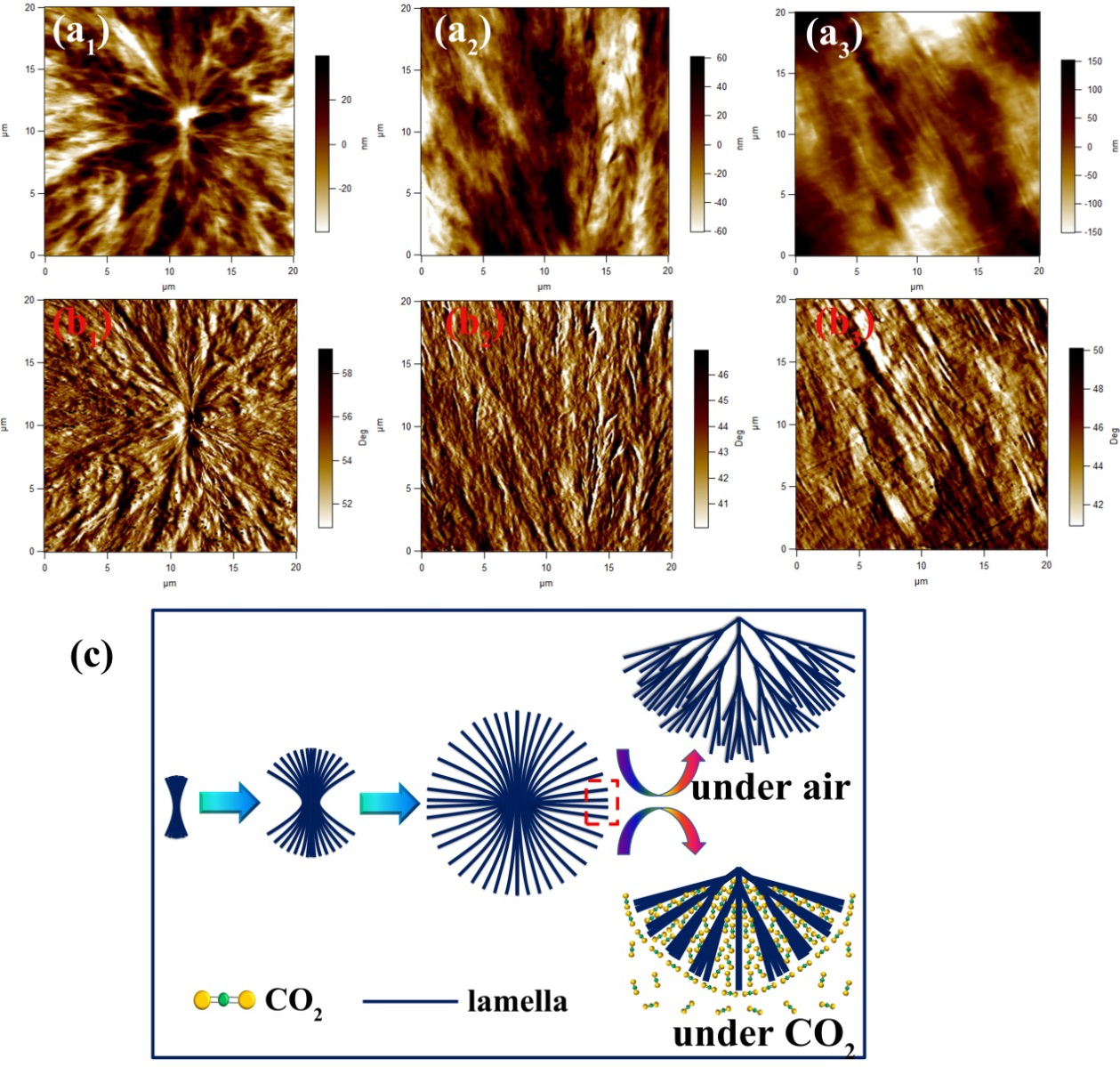 Figure 3 AFM height images and phase images of PLA treated under air and CO2