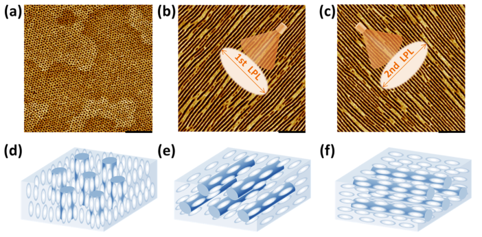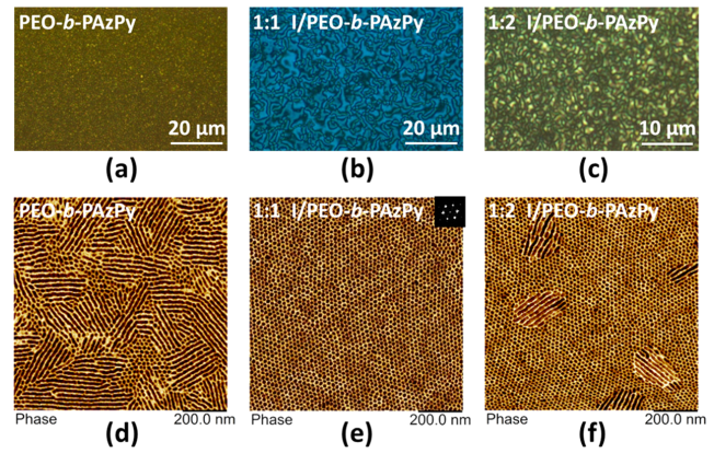 �D3. �u�I������Һ��Ƕ�ι����ﱡĤ�г�����Һ����Ԫ�c����x�Y(ji��)��(g��u)�Ĺ�ȡ����a-c������d-f���քe�����N��B(t��i)���u�I��(f��)���ﱡĤ��AFM�D����Ĥ�г�����Һ����Ԫ�cPEO�{�������Ų�ʾ��D����a��d��Һ���ض����˻����b��e��460 nm��ƫ�����ݗ�պ���c��f���c���ξ�ƫ��ƫ����ֱ�ľ�ƫ���ٴ�ݗ�պ�