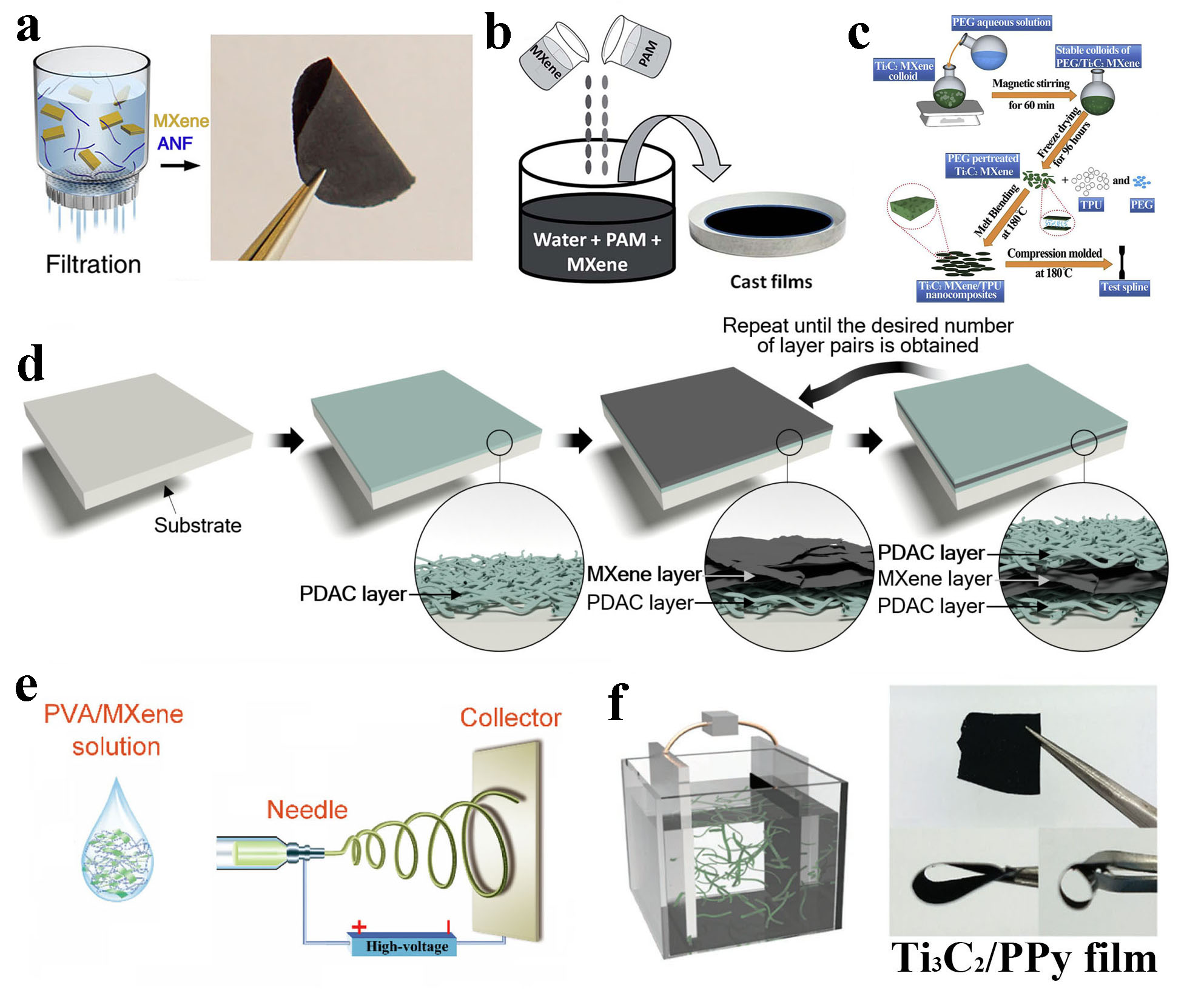 �D3. MXene/�ۺ��ﱡĤ���Ƃ䷽��������o����V��a������Һ��Ĥ��b�����ቺ��Ĥ��c�����ӌ��ԽM�b��d�����o늼��z��e���Լ�늻��W(xu��)���e��f����