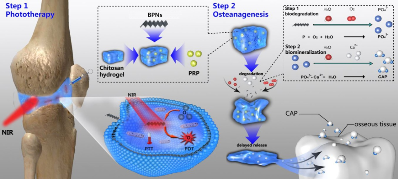 PRP-chitosan thermoresponsive hydrogel combined with black phosphorus nanosheets as injectable biomaterial for biotherapy and phototherapy treatment of rheumatoid arthritis.